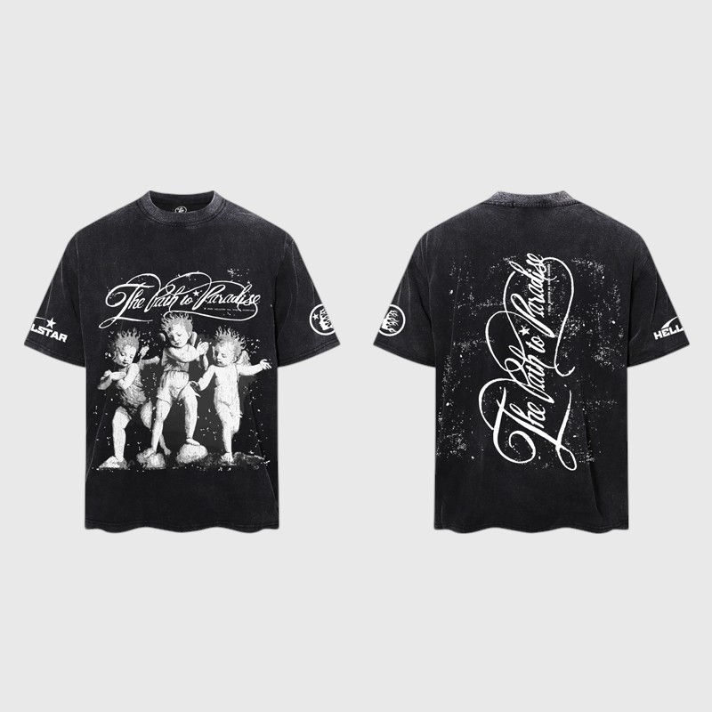 - “The Path to Paradise” Script: Above the cherubs, elegant script reads “The Path to Paradise,” adding a layer of philosophical depth and intrigue to the design. This thought-provoking phrase elevates the t-shirt from simple apparel to a conversational piece, embodying the spirit of Hellstar clothing.