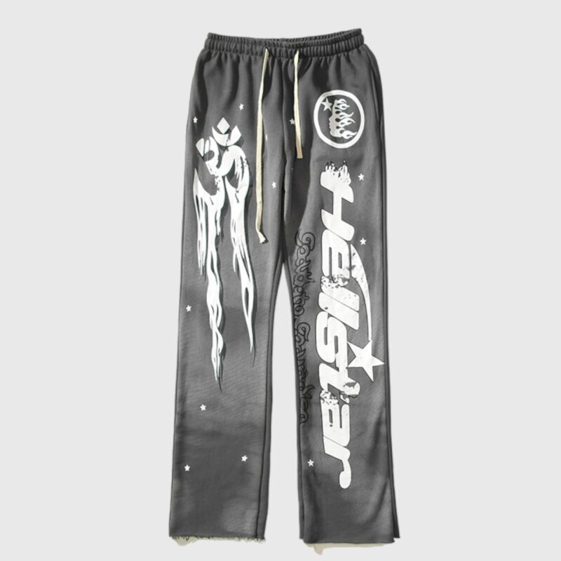 - Hellstar Branding: The sweatpants showcase the Hellstar brand name and logo in a faded black and gray design on the left leg, along with a circular motif on the left hip.