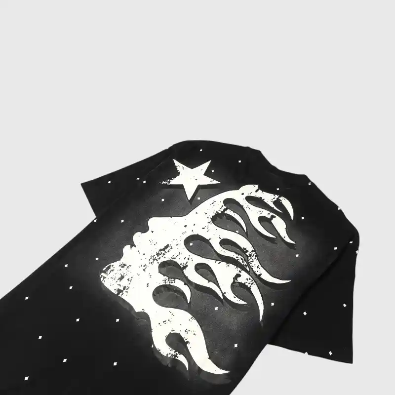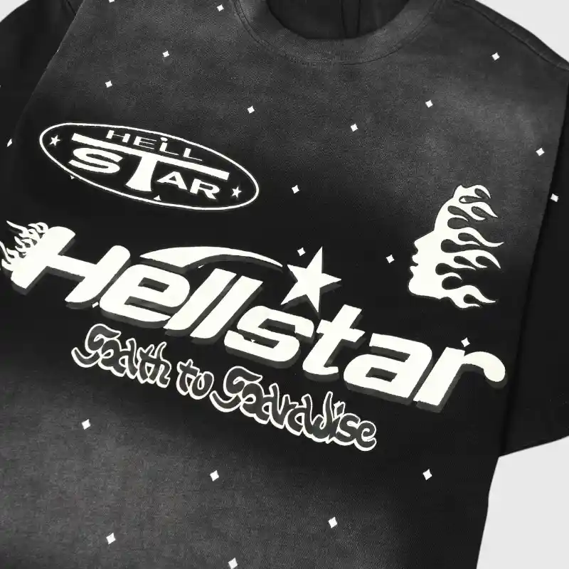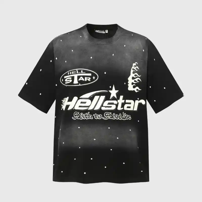 • Unique Starry Sky Graphic: The standout feature is the mesmerizing, all-over starry sky print, complete with iconic Hellstar branding seamlessly integrated into the celestial design. This star print shirt is a conversation starter and a true head-turner.
